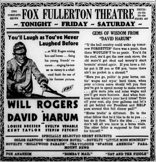 For culture and entertainment, Fullertonians went to see movies at the Fox Theater.