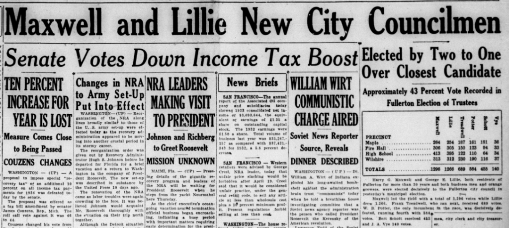 In local political news, Harry Maxwell and George Lillie were elected to Fullerton City Council. Both were local businessmen and orange growers.