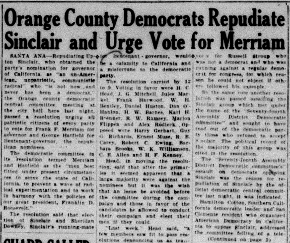 The Fullerton Daily News-Tribune ran numerous articles and editorials portraying Sinclair as a dangerous radical who would bring ruin to California.