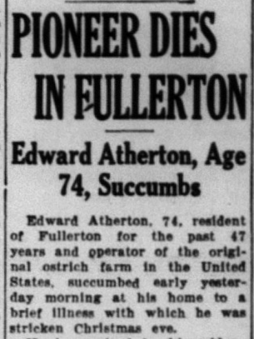 Edward Atherton, the famous Fullerton ostrich farmer, died.