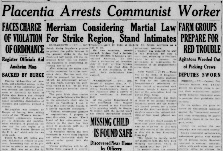 “Charles McLauchlan of Anaheim, self-admitted worker in the interests of the communist party, was arrested late yesterday afternoon at Placentia by Chief of Police Gus Barnes and charged with violation of the city ordinance prohibiting distribution of circulars and handbills without a license,” the Tribune reported.