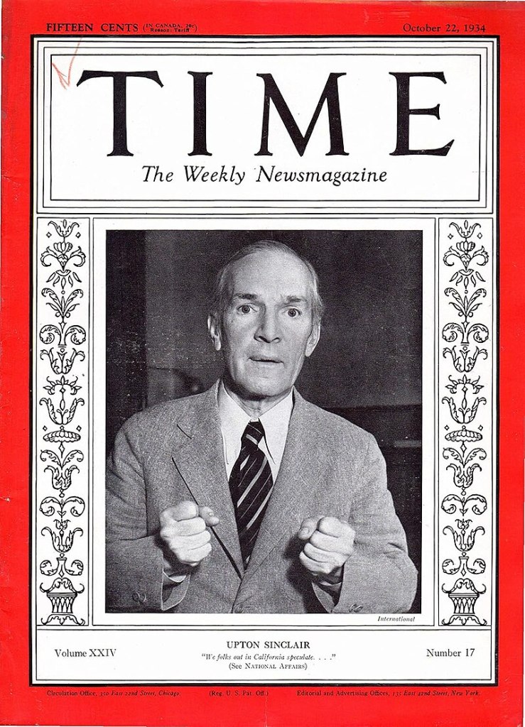 In the midst of these economic hard times and labor agitation, noted author and socialist Upton Sinclair ran for governor of California. Sinclair, most famous for his 1905 novel The Jungle, which portrayed the filthy and inhumane conditions of the meatpacking industry, had spent his life writing numerous books highlighting various injustices and corruption in American life.