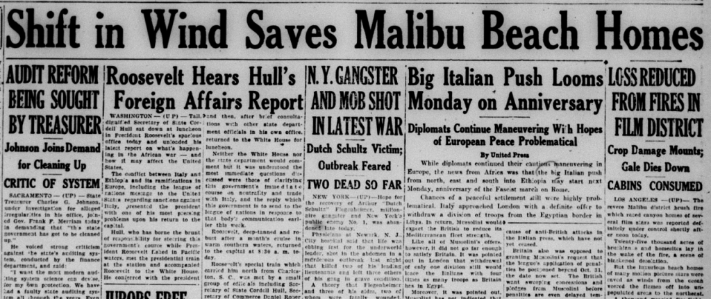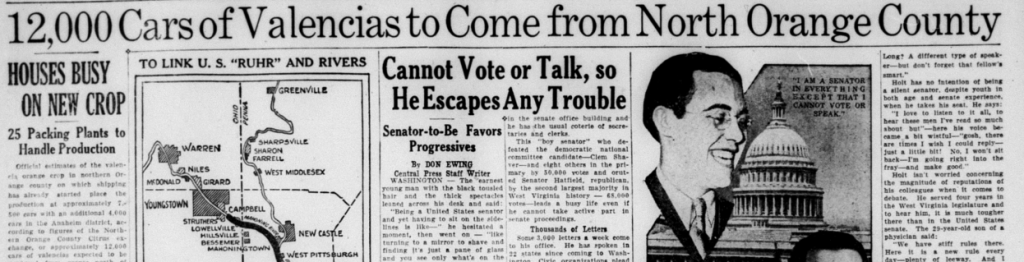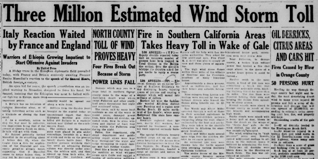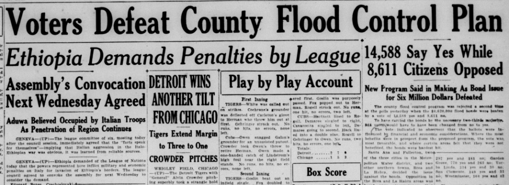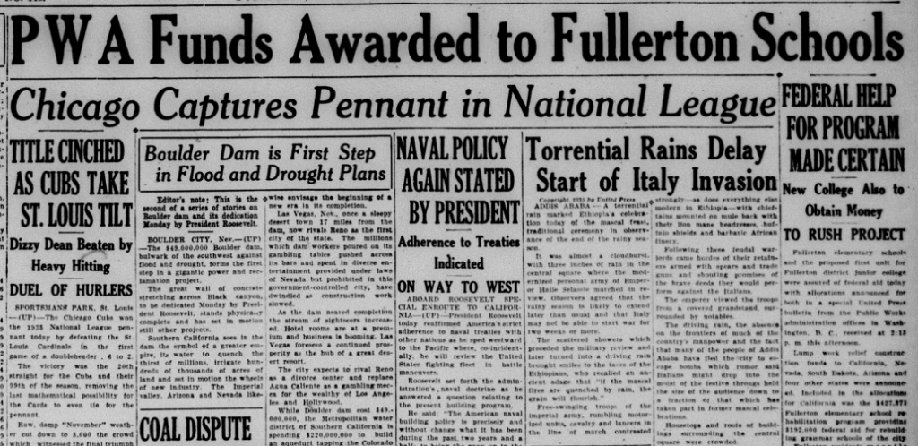 The Local History Room of the Fullerton Public Library has microfilm from the Fullerton Daily News-Tribune newspaper stretching back to 1893. I am in the process of reading over the microfilm, year by year, to get a sense of what was happening in the town over the years, and creating a mini archive. Below are some news stories from 1935.