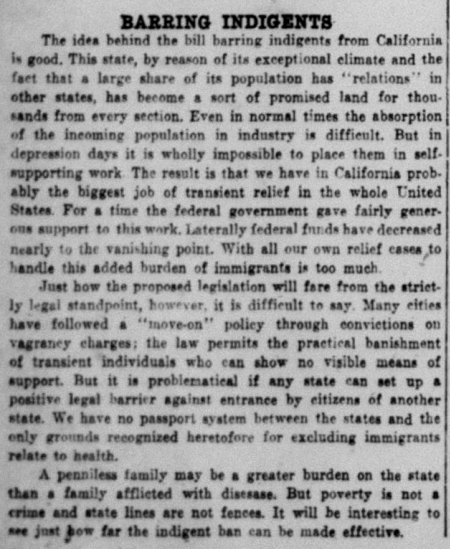 Hard economic times also led to an increase in homelessness. Some Californians sought to “solve” this problem by actually barring poor people from California.