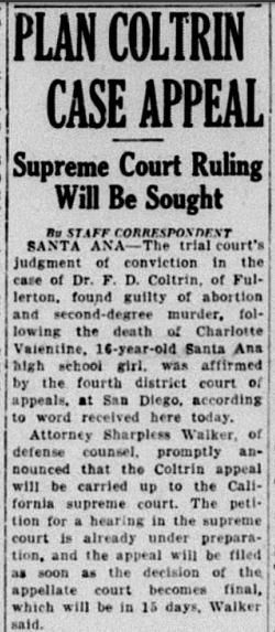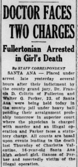 Fullerton doctor Francis Coltrin was arrested and charged with second degree murder and for performing an abortion after a 16 year-old girl named Charlotte Valentine died during a failed abortion.