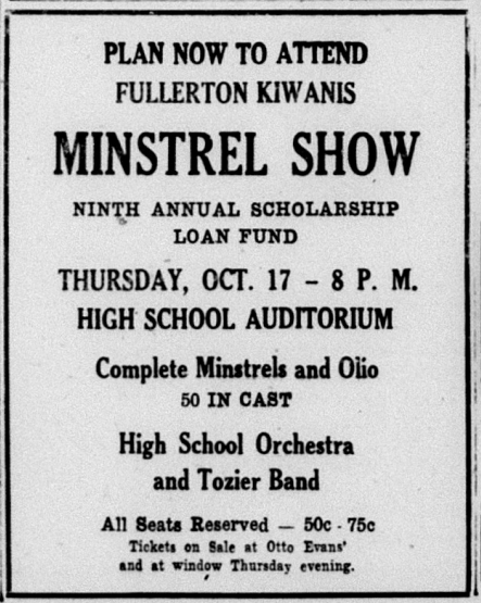 Unfortunately, a popular form of entertainment in the 1930s was the minstrel show, featuring white performers in blackface perpetuating harmful stereotypes of African Americans. Some of these took place locally.