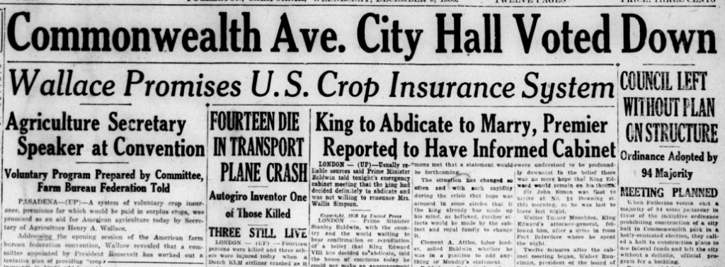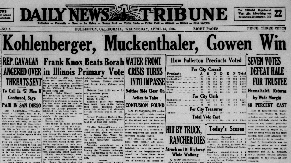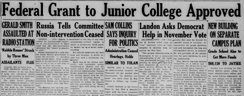 The Local History Room of the Fullerton Public Library has microfilm from the Fullerton Daily News-Tribune newspaper stretching back to 1893. I am in the process of reading over the microfilm, year by year, to get a sense of what was happening in the town over the years, and creating a mini archive. Below are some news stories from 1936.
