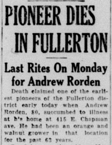 Rorder, a native of Germany was born in 1866 on the Island of Fohr, off Prussia. He came to the United States and to Fullerton in 1873 before the town was founded. He was a rancher.