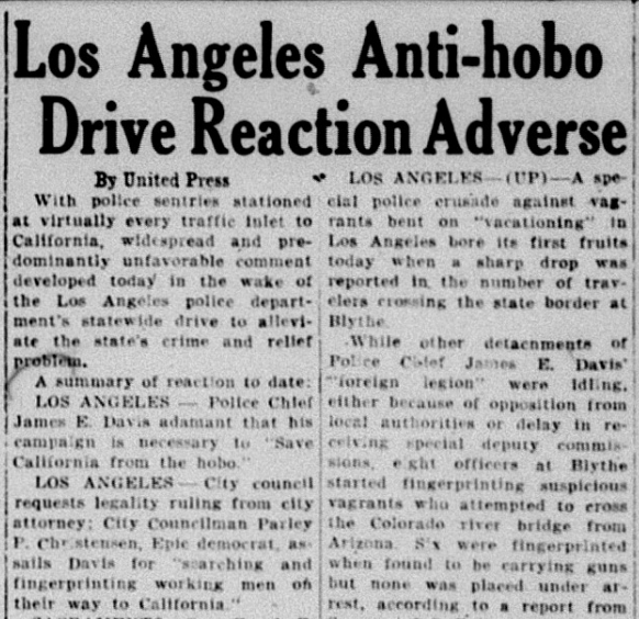 The financial troubles of the Great Depression led to a big increase in homelessness and poverty. The Los Angeles Police department took the extreme (and illegal) action of sending officers to the California border with neighboring states to block “Indigent Alien Transients” (aka, the poor) from entering California.
