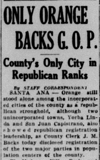 At this time, during the Great Depression, Democrats held a voting majority in all Orange County cities except Orange.