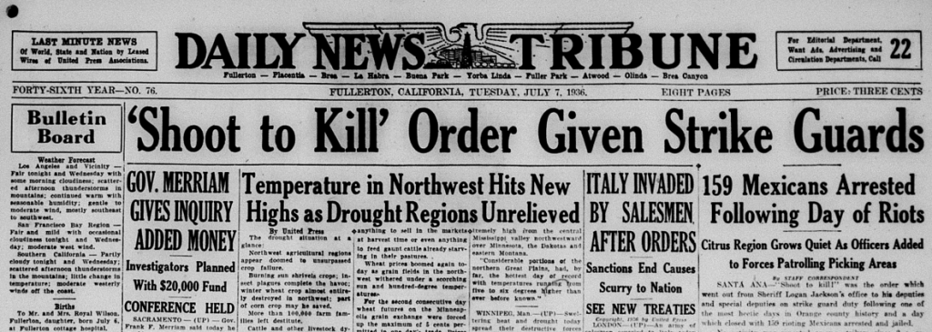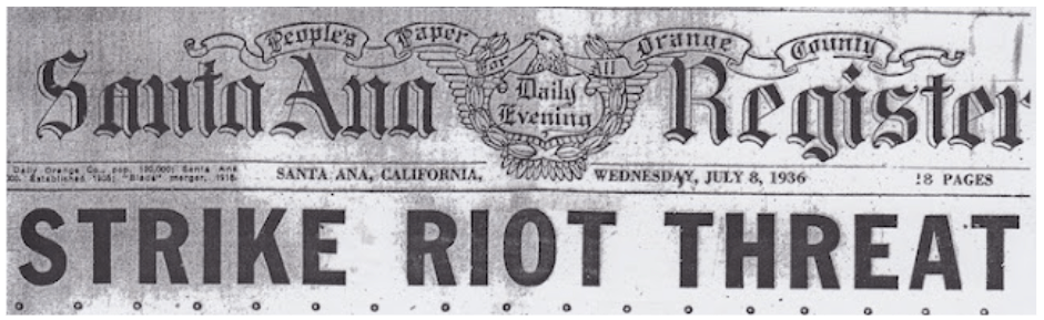 “During the month of July (1936), northern Orange County experienced a kind of civil war,” Reccow writes. “Increased picketing, violence, armed deputies by the score, vigilante attacks, mass arrests and trials, shoot-to-kill orders, calls for State interference, along with California State Federation of Labor and federal government involvement–all contributed to the situation.”