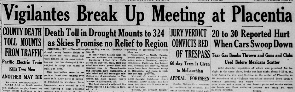 “Wild disorder, repetition of which was promised for tonight at the same place, broke out last night about 9:15pm, near Santa Fe ave. and Melrose in the center of Placentia as 40 Americans of a vigilante committee swooped down upon a Mexican gathering and with guns, clubs and a score of tear gas bombs sent them scattering in ever direction,” the News-Tribune reported. “Reports…stated 20 to 30 Mexicans and a few of the white men were injured, cars were smashed and other damage done. Several Mexicans among the group, who had gathered on the Luis Varcas handball court for a meeting told officers they definitely recognized ‘Stuart Strathman as the supposed leader of the raid.’”
