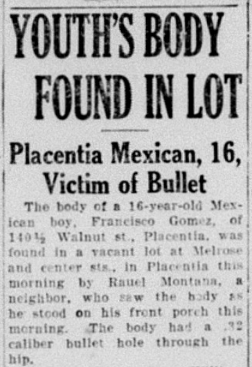 Tensions between the Mexican community and the more affluent (and politically powerful) white community were inflamed when the dead body of 16-year old Francisco Gomez was found in a vacant lot in Placentia. The body had a .32 caliber bullet hole through the hip.