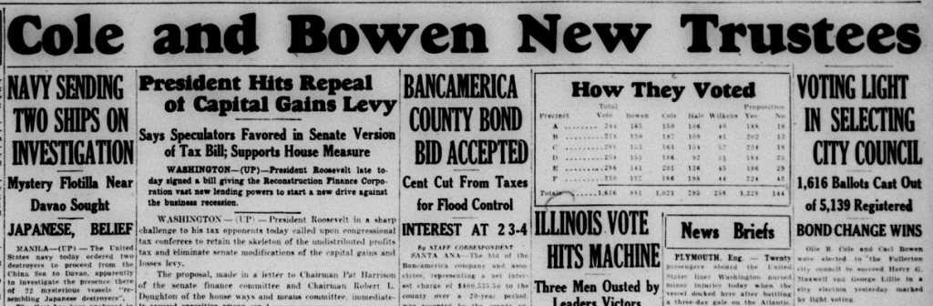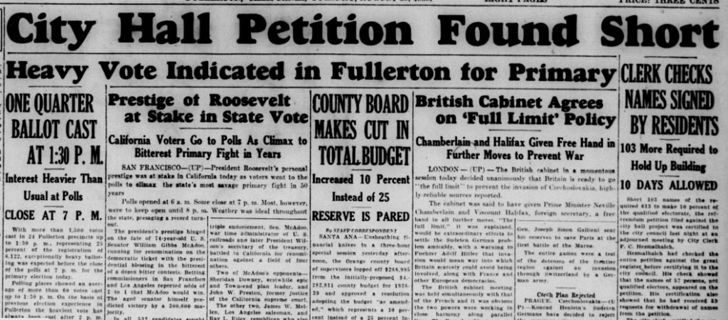 The Local History Room of the Fullerton Public Library has microfilm from the Fullerton Daily News-Tribune newspaper stretching back to 1893. I am in the process of reading over the microfilm, year by year, to get a sense of what was happening in the town over the years, and creating a mini archive. Below are some news stories from 1938.