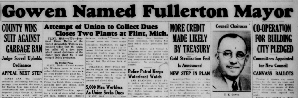 Thomas Gowen was named Fullerton’s mayor for 1938.