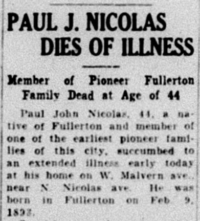 Paul J. Nicolas, son of pioneer rancher Pierre Nicolas, died.