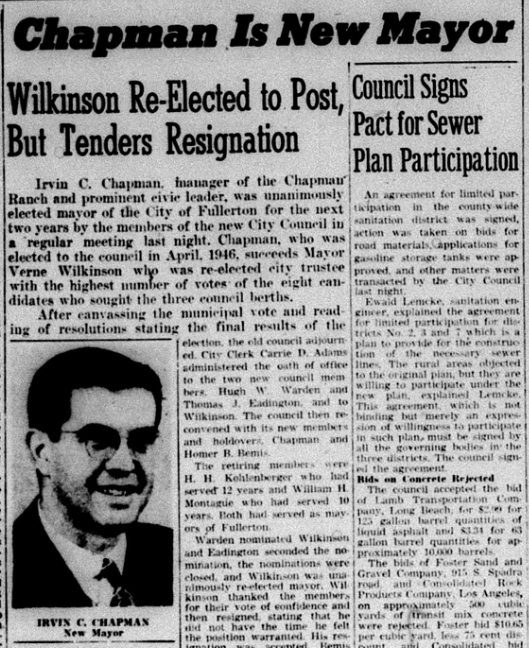 Irvin “Ernie” Chapman, son of Fullerton’s first mayor Charles C. Chapman, was chosen as mayor.