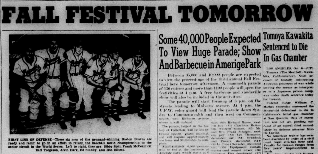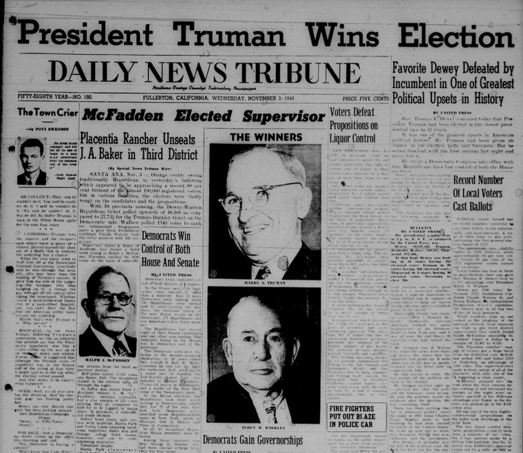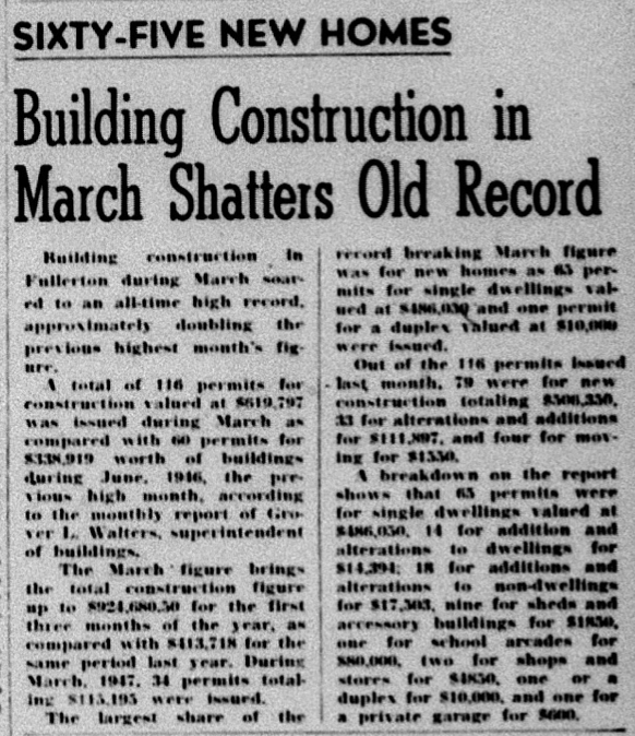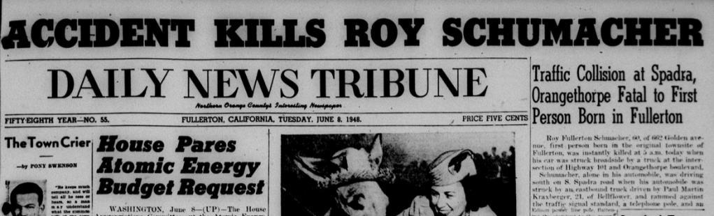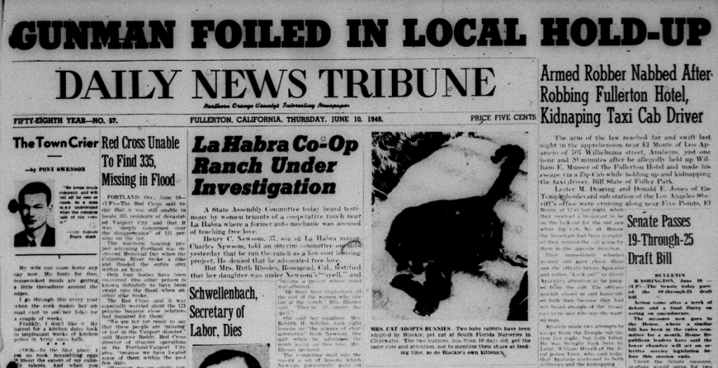 The Local History Room of the Fullerton Public Library has microfilm from the Fullerton Daily News-Tribune newspaper stretching back to 1893. I am in the process of reading over the microfilm, year by year, to get a sense of what was happening in the town over the years, and creating a mini archive. Below are some news stories from 1948.