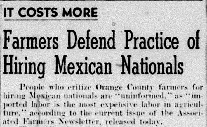 Most of the citrus workers were Mexican, many of whom were recruited to work in local fields by the Bracero Program. The large presence of of Mexicans in Fullerton was sometimes protested by white residents.