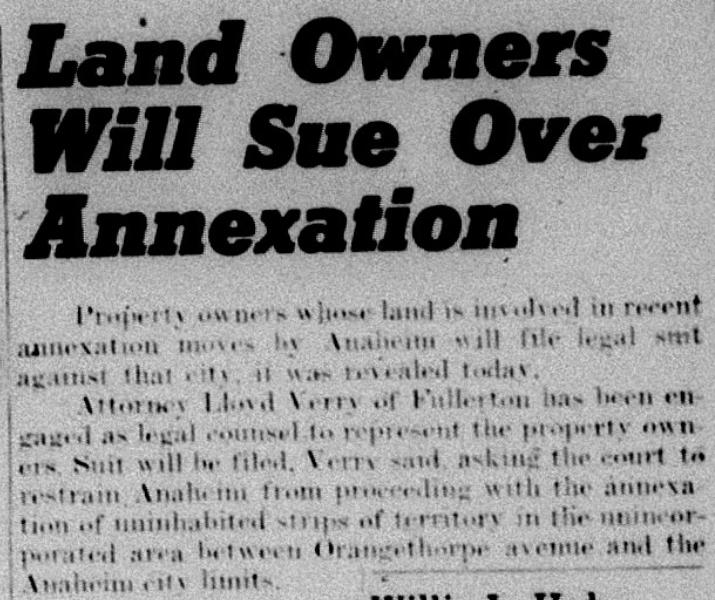 As both Fullerton and Anaheim grew, annexation fights began between the two cities to incorporate land between the two cities. The first salvo of this fight occurred when Anaheim city officials convened a special Saturday session to annex a 60-foot strip close to the south border of Fullerton.