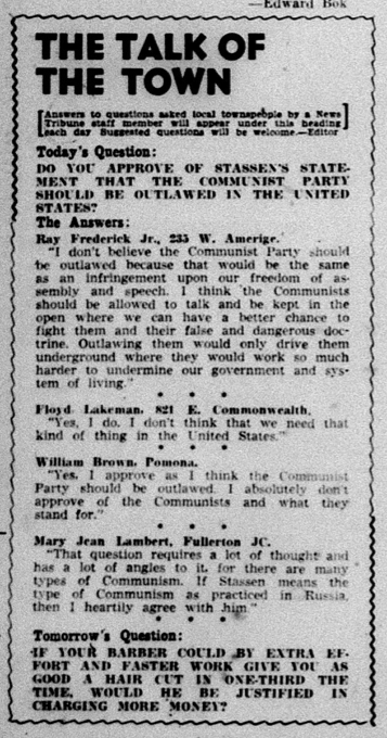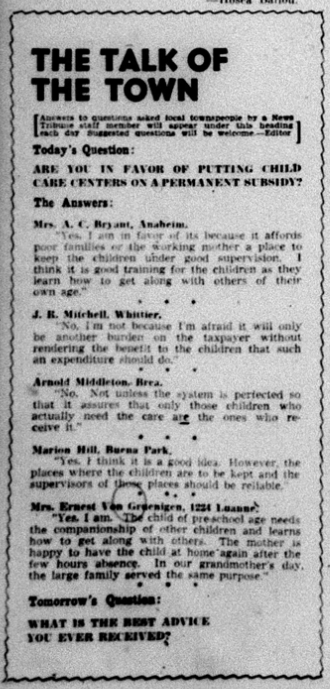 The Fullerton News-Tribune had a section called “Talk of the Town” in which local residents were asked to give their opinions on a variety of social issues. Here is a sampling: