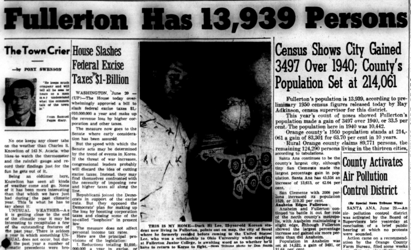 The Local History Room of the Fullerton Public Library has microfilm from the Fullerton Daily News-Tribune newspaper stretching back to 1893. I am in the process of reading over the microfilm, year by year, to get a sense of what was happening in the town over the years, and creating a mini archive. Below are some news stories from 1950.