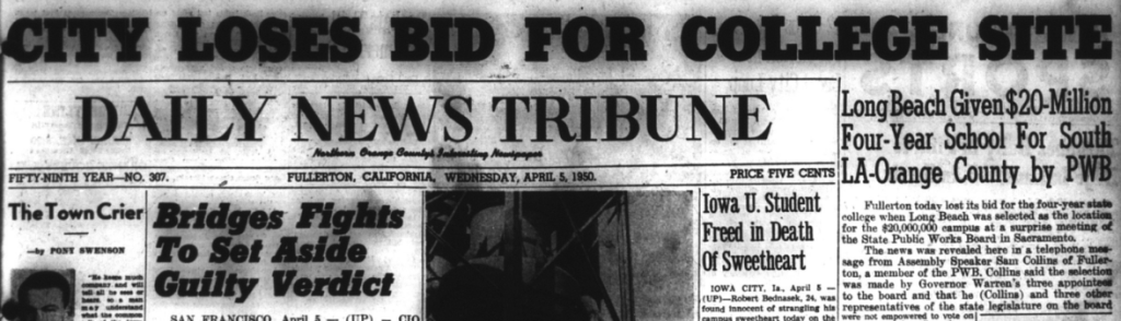 Fullerton put in a bid to be home to a new state college. Unfortunately, they lost out to Long Beach. It would be another decade before CSUF came to Fullerton.