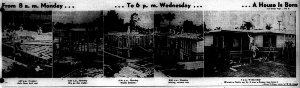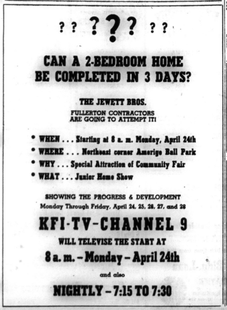 Fullerton continued to experience rapid growth, as many new housing subdivisions provided affordable homes. To demonstrate to the world that Fullerton was growing fast, local developers the Jewett Brothers hosted a big PR event in which workers built a whole house in three days.