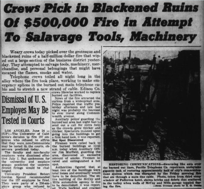 Probably the biggest and most tragic news story of 1950 was a massive fire that destroyed three major buildings downtown in the 100 block of West Commonwealth–the McCoy Mills Ford Agency, Pacific Citrus Products (famous for making Hawaiian Punch), and the old Fullerton Hotel. The damage was estimated at $500,000. Only one person was injured.