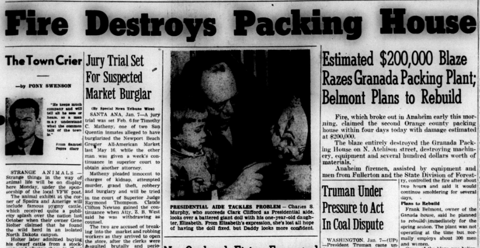 “An early morning fire, believed to be the worst in the history of the city, and probably the worst in Northern Orange County, totally destroyed an automobile agency, a citrus products plant, a 58-room hotel, and damaged a hardware store,” the News-Tribune reported.