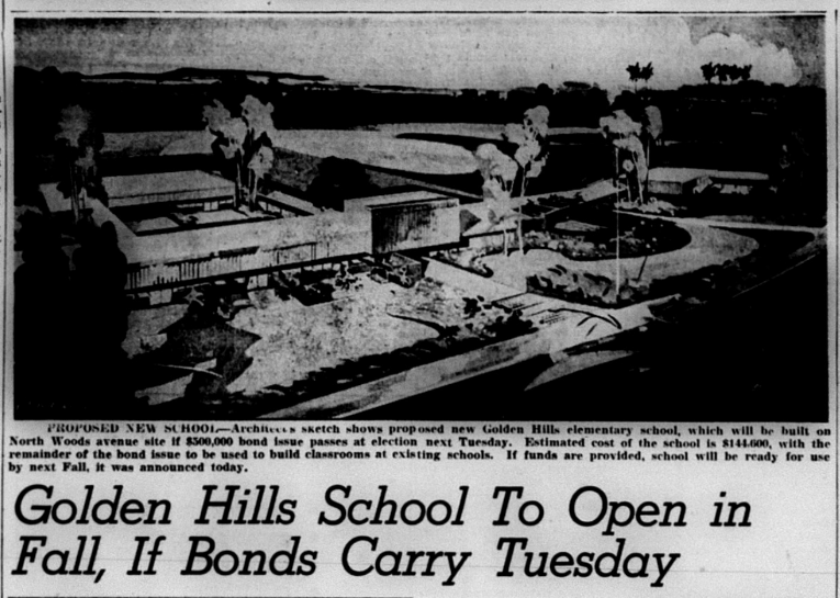 In education news, Golden Hills Elementary School was planned, to be built with bonds approved by the voters. Many new schools were built in the 1950s and 1960s as the area grew in population.