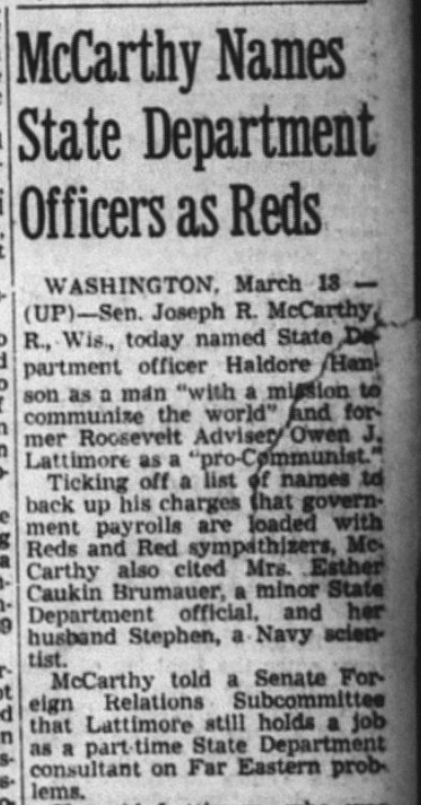 On the homefront, Senator Joseph McCarthy was terrorizing American liberals and progressives by accusing many people of being communists, usually on the flimsiest of evidence.