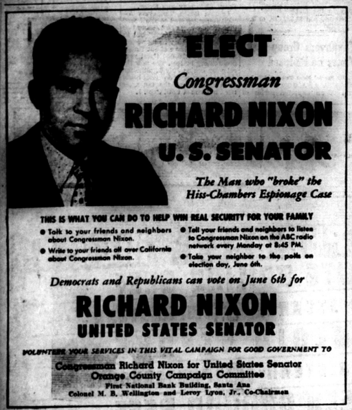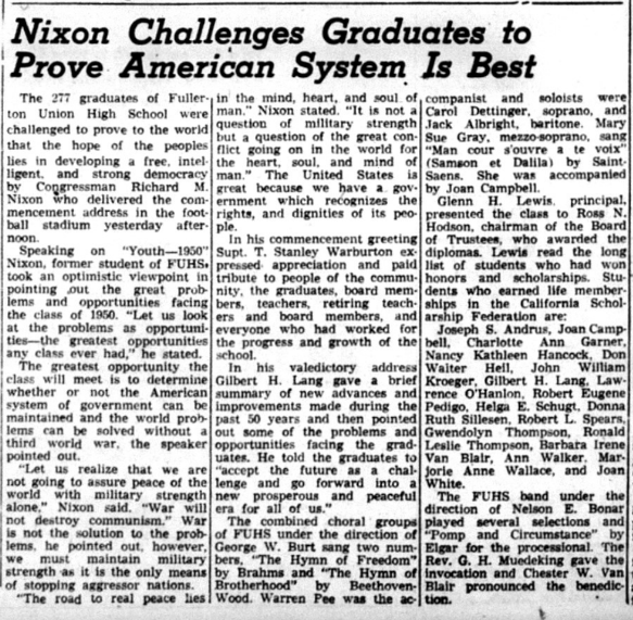 Being a local figure who was also running for Senate, Nixon made many appearances in Fullerton in 1950, including speaking at the FUHS commencement.
