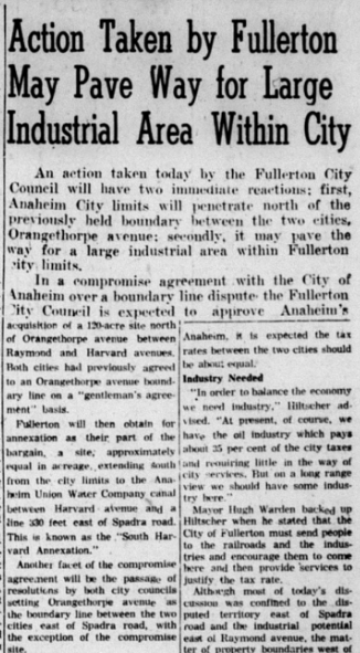 As both Fullerton and Anaheim sought to expand, they agreed on a new boundary line separating the two towns.