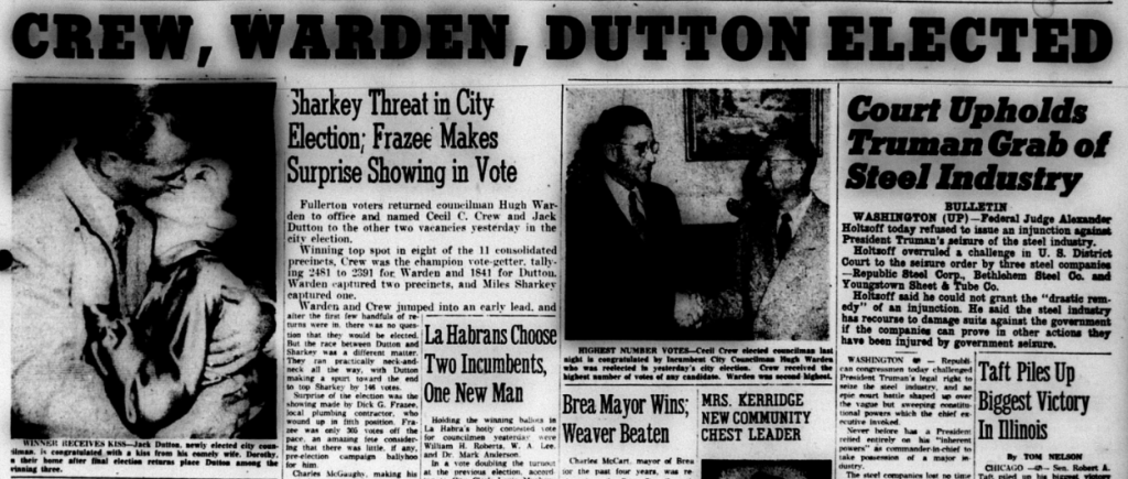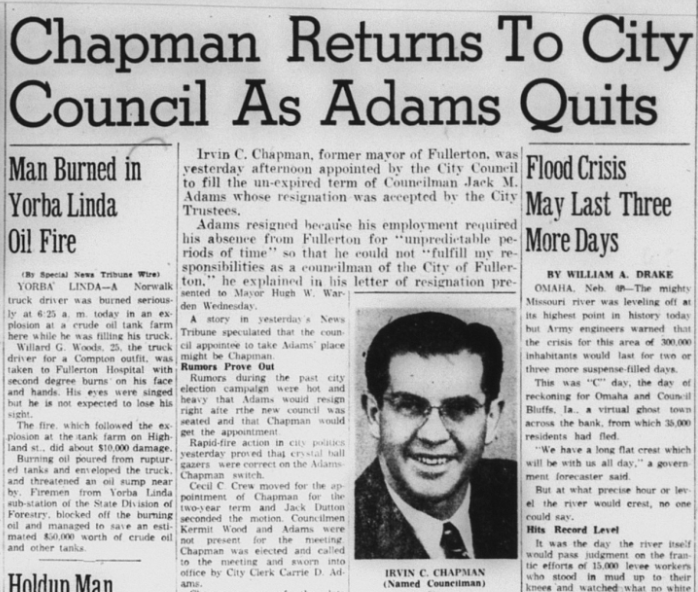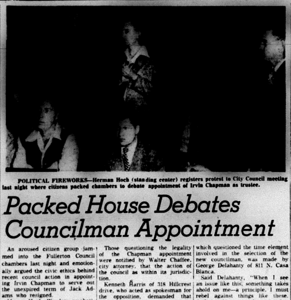 “I believe the voters showed two years ago, beyond all doubt, that they did not want Chapman on the City Council!” a reader wrote in a letter to the editor of the Fullerton News-Tribune. “I believe it is a little-disputed fact that the incumbent always has the edge in an election, yet two generally unknown men came in ahead of the then-incumbent Irvin Chapman. There are going to be a lot of very unhappy voters if he is permitted to sneak in the back door after that had showed him out the front—they thought!”