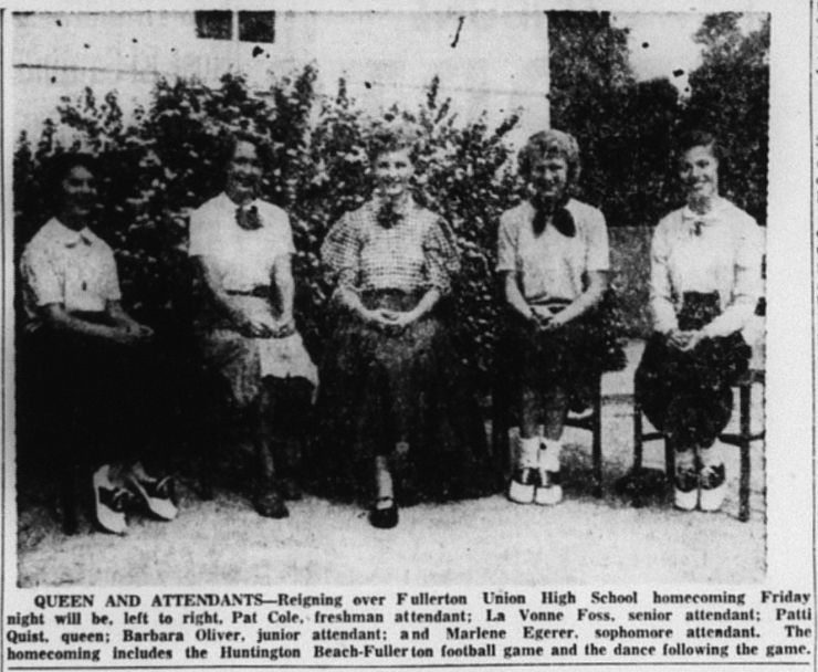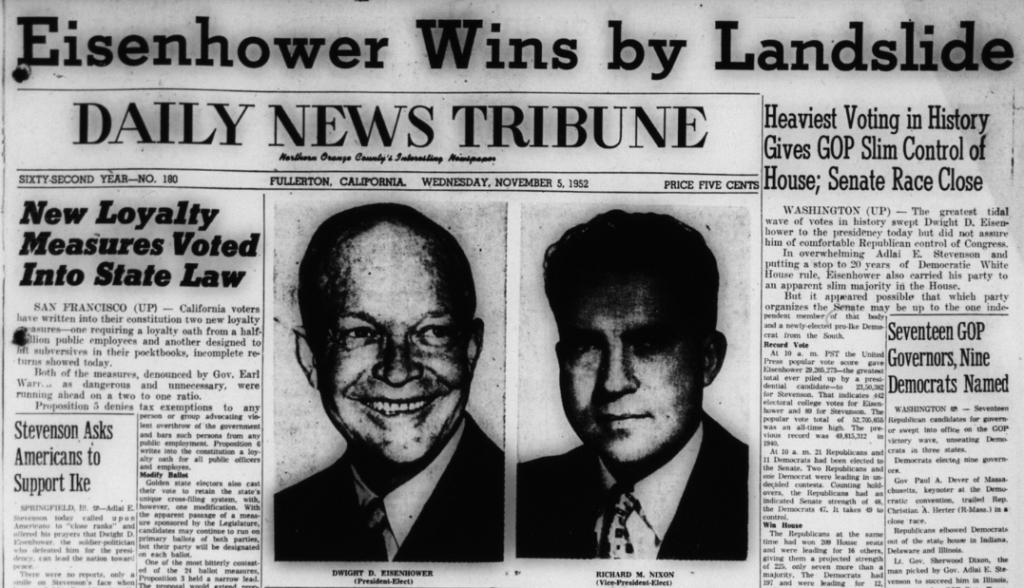 Dwight D. Eisenhower was elected president, and his Vice President was local boy Richard Nixon, who was born in Yorba Linda and attended Fullerton High School.
