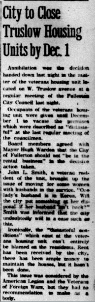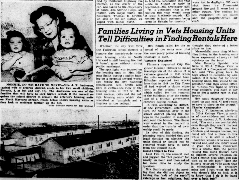 “City Planning Commission yesterday recommended that Fullerton high school and junior college district remove the veteran’s housing from North Harvard avenue on or before July 1, 1954,” the News-Tribune reported. “Two housing foes, one who called the establishment of the housing units ‘strictly a socialist measure,’ were present at the hearing to voice objections to the housing units being located on North Harvard avenue.”