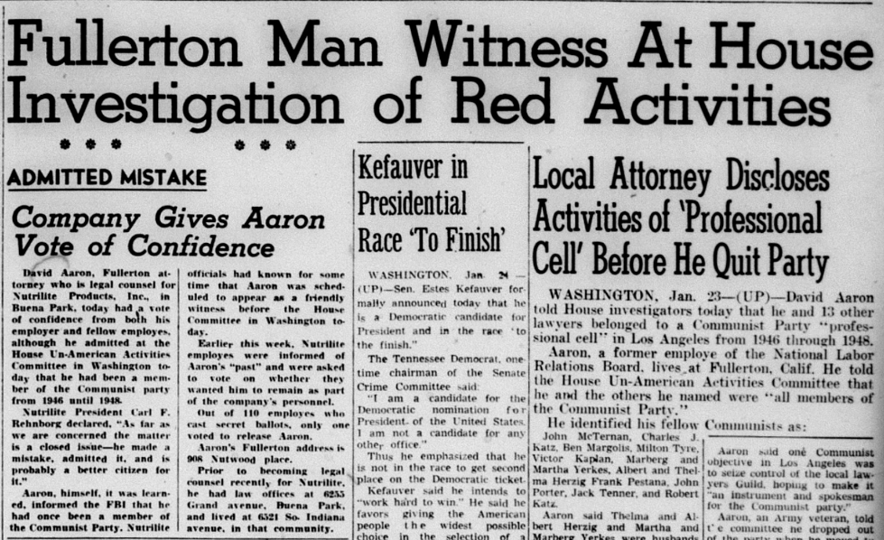 A Fullerton lawyer named David Aaron testified that he had been a communist in the late 1940s while serving on the National Labor Relations Board.