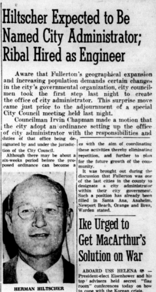 Even before he became City Administrator, Hiltscher was city engineer. According to the News-Tribune, “All recent subdividing throughout the community has been controlled by standards set by the engineering office under Hiltscher’s management, which has brought Fullerton to be known as ‘The City of Beautiful Homes.’”