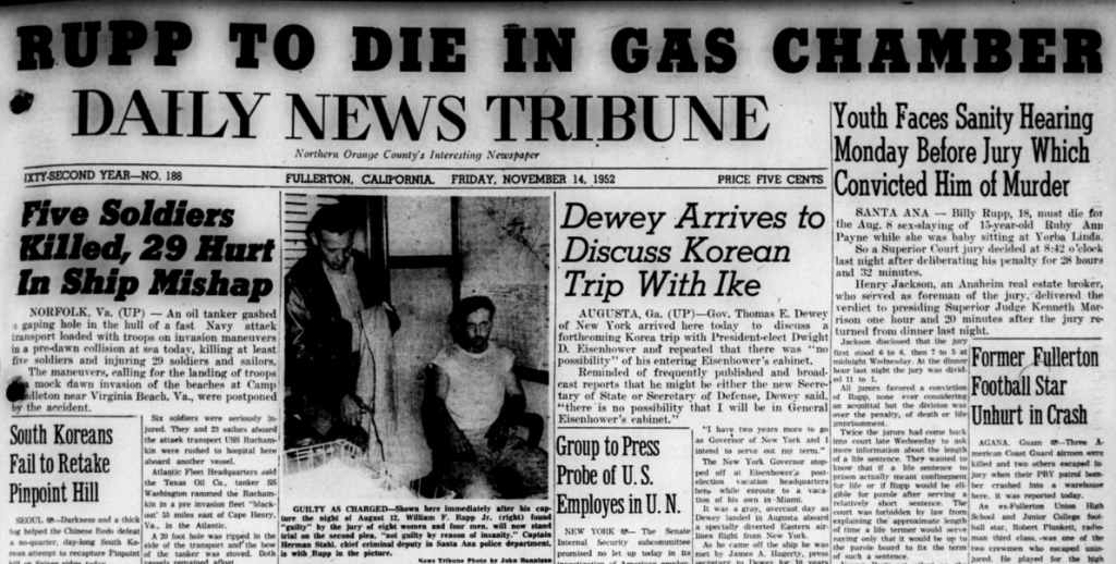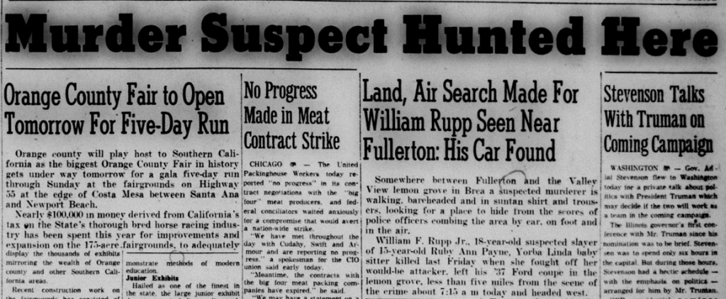The highest profile local crime of 1952 was the murder of Ruby Ann Payne by William Rupp.