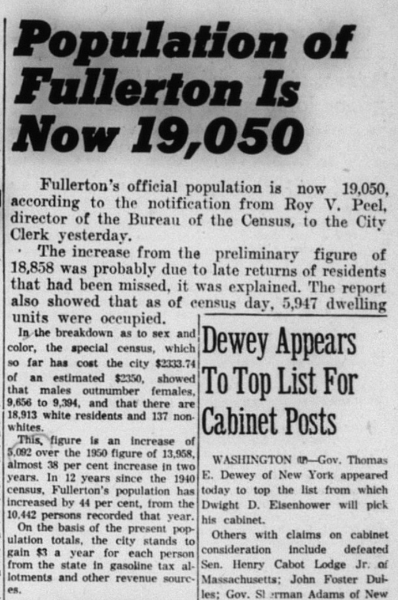 The Local History Room of the Fullerton Public Library has microfilm from the Fullerton Daily News-Tribune newspaper stretching back to 1893. I am in the process of reading over the microfilm, year by year, to get a sense of what was happening in the town over the years, and creating a mini archive. Below are some news stories from 1952.