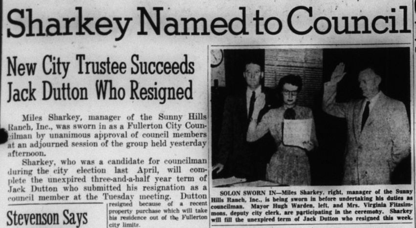 It is notable that the very year Fullerton sought to impose the Council-Manager system, two elected City Councilmen resigned and were replaced by unelected appointees who were just the sort of “regional capitalists” Olin describes: Irvin Chapman (of the wealthy, landowning Chapman family), and Miles Sharkey (manager of the vast Sunny Hills properties).