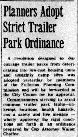 The preferred type of housing in Fullerton was the single family home. Residents and local leaders, as they are today, were generally opposed to low-income housing, apartments, and trailer parks.