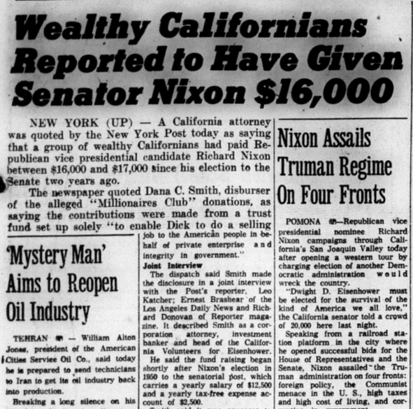 Six weeks before the 1952 presidential election, it was reported that Nixon had received between $16,000 and $18,000 (approximately $220,000 in 2025 dollars) not in campaign contributions, but directly from a fund bankrolled by a group of 76 wealthy Californians.