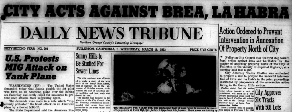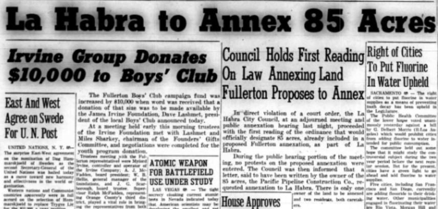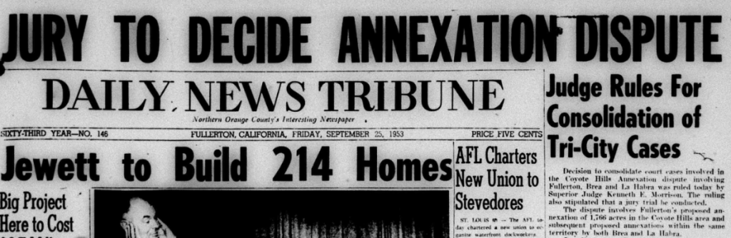 Part of Fullerton’s growth involved fights with other local cities over annexation of unincorporated land, specifically Brea and La Habra.
