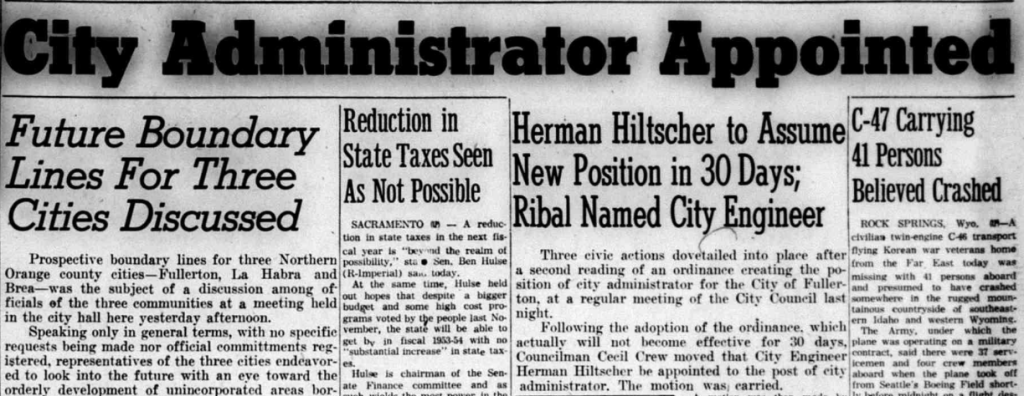 In 1953, Fullerton made a major change in its system of governance by creating the position of City Administrator (now called City Manager). This unelected bureaucrat would now (arguably) have as much power to create policy as the former City Council.