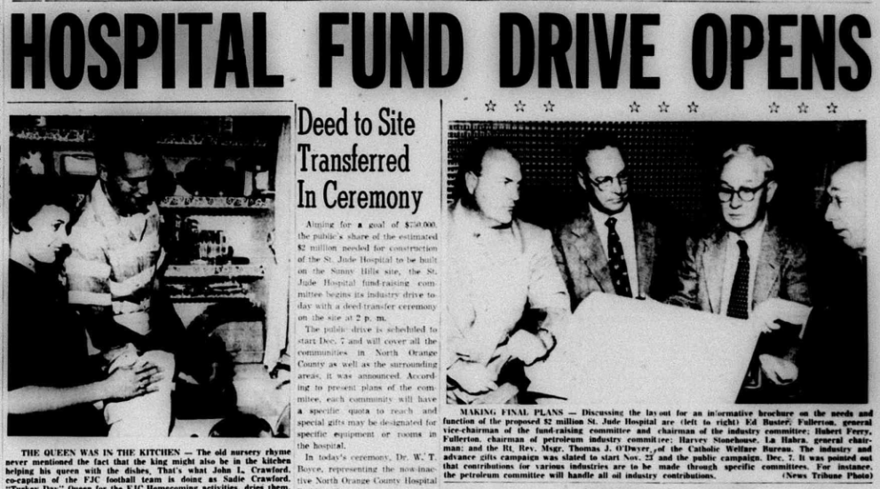 It was decided that a new, much larger, hospital needed to be built, and so local groups worked to acquire the land on the former Sunny Hills Ranch that would eventually become St. Jude Hospital.