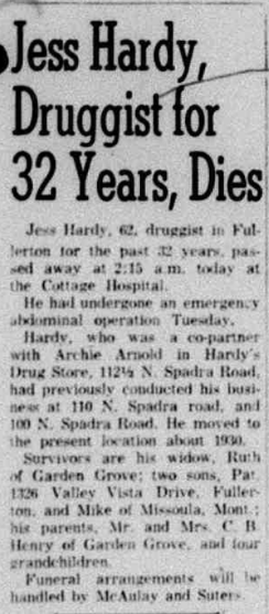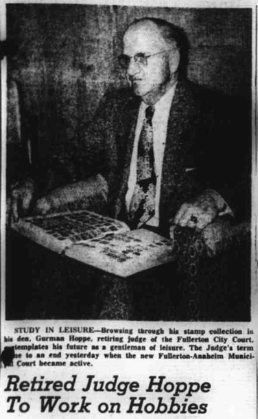 Fullerton’s City Judge since 1948, local business man since 1920 Gurman Hoppe retired. Hoppe came to Fullerton in 1912 and worked for the Stern and Goodman department store. In 1927 he went into business for himself, running Hoppe’s Hardware store at 104 and 106 S. Spadra road.