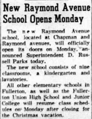 Fullerton’s growth involved the building of new schools opening, including Raymond Avenue Elementary School.