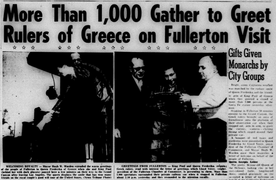 Over 1000 people gathered to greet the ruler of Greece when his train stopped briefly in Fullerton.